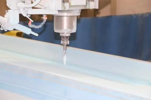 The water jet uses a stream of extremely high pressure water to produce clean cuts through metal and other materials. At VHA, we use the water jet for such tasks as cutting root fittings out of raw stock and trimming abrasion strips.